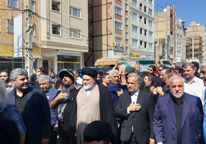 مراسم وداع و تشییع از میدان هفت تیر نسیمشهر آغاز شد؛ جایی که مردم با پرچمهای عزاداری و عکسهای شهید بر دست، پیکر مطهر را بر دوش گرفتند و با شعارهای «لبیک یا حسین(ع)» و «مرگ بر اسرائیل» خشم و نفرت خود را از دشمنان اسلام فریاد زدند. در طول مسیر، بانوان و کودکان نیز با نثار گل، یاد شهید را گرامی داشتند.