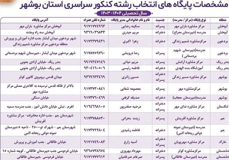 به گزارش خبرگزاری تسنیم از بوشهر، محمود حسنی توابع، معاون پرورشی و فرهنگی آموزش و پرورش استان بوشهر ظهر امروز در جمع خبرنگاران با اشاره به اعلام نتایج کنکور سراسری، از راه‌اندازی پایگاه‌های تخصصی انتخاب رشته کنکور در استان بوشهر خبر داد و بیان کرد: از امروز 11 شهریورماه، همزمان با آغاز فرآیند انتخاب رشته کنکور از طریق سایت سنجش، 35 پایگاه مشاوره حضوری انتخاب رشته در نواحی مختلف استان بوشهر فعالیت خود را آغاز کردند.