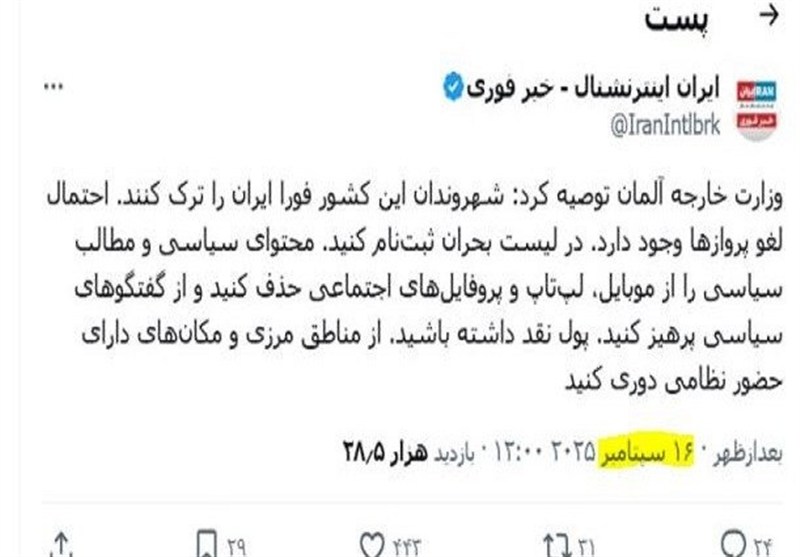 به گزارش گروه بینالملل خبرگزاری تسنیم، در حالی که شبکه ایران اینترنشنال خبری درباره هشدار آلمان به شهروندان خود برای ترک فوری ایران منتشر کرده، بررسی محافل خبری نشان میدهد این خبر متعلق به حدود سه هفته قبل بوده و در واقع صفحه اینستاگرام سفارت آلمان در تهران و وبگاه وزارت خارجه این کشور مدتی است که بهروزرسانی باموضوع ایران نداشته است.