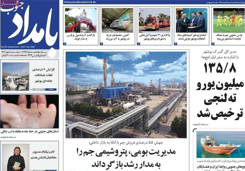 به گزارش خبرگزاری تسنیم از بوشهر، تصاویر منتخب صفحات مطبوعات استان بوشهر در 8 مهر ماه منتشر شد. این صفحات نخست بازتابدهنده مهمترین رویدادها، اخبار و تحولات اقتصادی، گردشگری، محیطزیستی و اجتماعی استان هستند و نگاه رسانهها را به مسائل روز بوشهر ارائه میدهند.