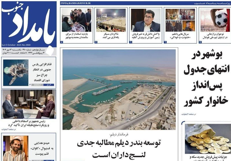 به گزارش خبرگزاری تسنیم از بوشهر، تصاویر منتخب صفحات نخست روزنامه‌های یکشنبه 13 مهر در استان بوشهر(رویداد پارس، بامداد جنوب و پیام عسلویه) منتشر شد. این صفحات نخست بازتاب‌دهنده مهم‌ترین رویدادها، اخبار و تحولات اقتصادی، گردشگری، محیط‌زیستی و اجتماعی هستند و نگاه رسانه‌ها را به مسائل روز استان بوشهر ارائه می‌دهند.