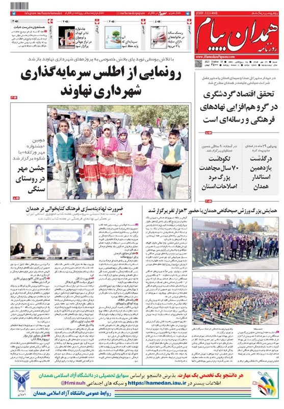 به گزارش خبرگزاری تسنیم از همدان، تصاویر منتخب صفحات نخست روزنامههای شنبه بیستوششم مهرماه در استان همدان منتشر شد. این صفحات نخست، نمایانگر مهمترین اخبار، تحولات و رویدادهای اجتماعی، سیاسی، اقتصادی و فرهنگی استان و کشور هستند و نگاه رسانهها را به مسائل روز همدان منعکس میکنند.