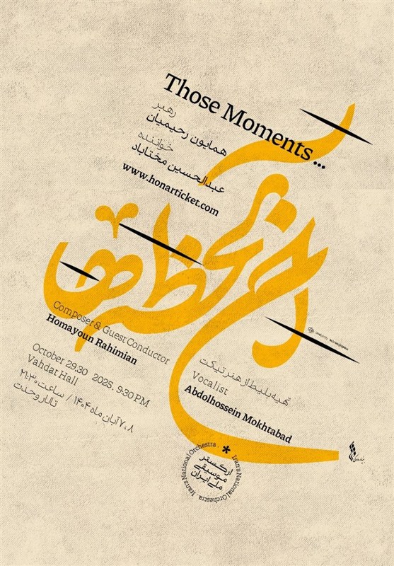 کنسرت «آن لحظهها»؛ اجرای ارکستر موسیقی ملی ایران با رهبری همایون رحیمیان و خوانندگی عبدالحسین مختاباد، چهارشنبه و پنجشنبه، 7 و 8 آبان ماه از ساعت 21:30 در تالار وحدت برگزار میشود.