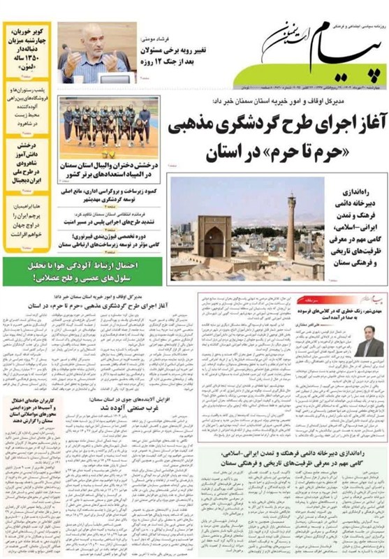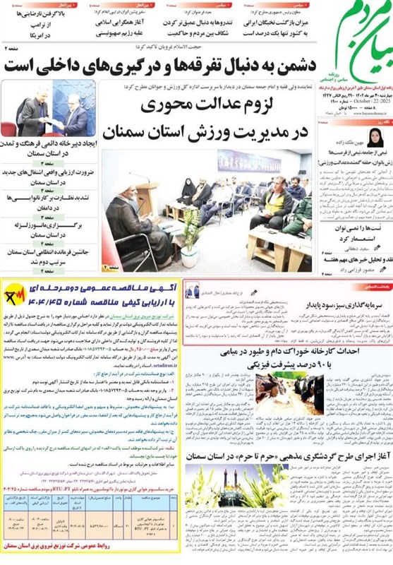 به گزارش خبرگزاری تسنیم از سمنان، تصاویر و تیترهای برگزیده صفحات نخست روزنامههای چهارشنبه 30 مهرماه در استان سمنان (بیان مردم) و (پیام استان سمنان) منتشر شد، این مرور مطبوعاتی بازتابدهنده مهمترین رویدادها، چالشها و تحولات اقتصادی، اجتماعی و سیاسی استان است.