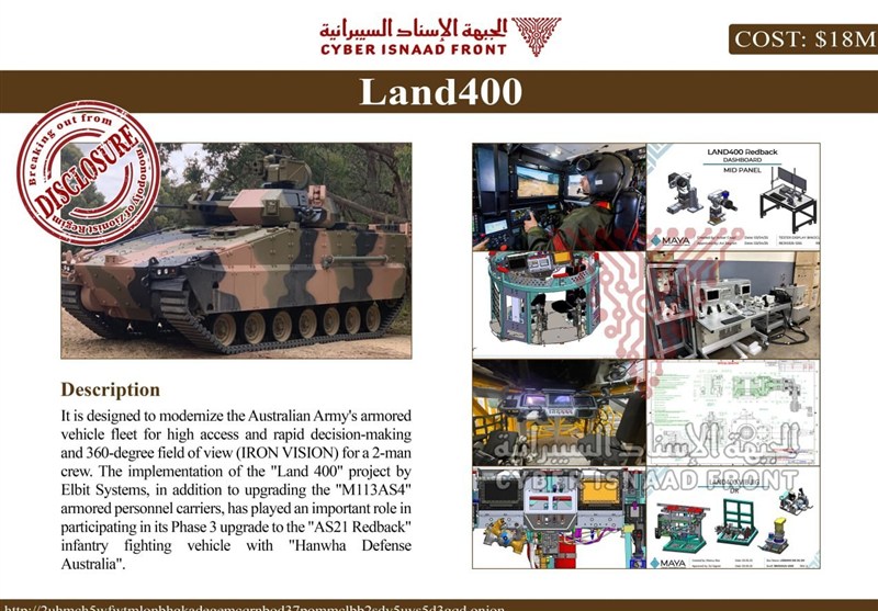 به گزارش گروه بین الملل خبرگزاری تسنیم، برخی رسانههای استرالیا طی گزارشی اعلام کردند که در پی حمله سایبری جبهه پشتیبان سایبری به صنایع نظامی اسرائیل، نقشههای سهبعدی محرمانه و جزئیات فنی خودروهای جدید پیادهنظام (Redback) که ارتش استرالیا طی قراردادی به ارزش 7 میلیارد دلار از شرکت صهیونی (elbitsystems) خریداری کرده بود، فاش شده است.