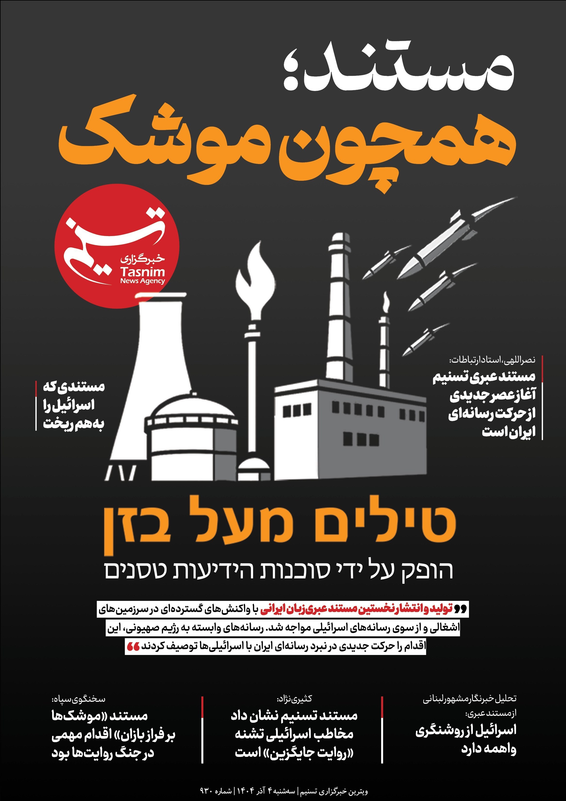 تولید و انتشار نخستین مستند عبری زبان ایرانی در خبرگزاری تسنیم با واکنش‌های گسترده‌ای در سرزمین های اشغالی و از سوی رسانه های اسرائیلی مواجه شد.رسانه‌های وابسته به رژیم صهیونی،این اقدام را حرکت جدیدی در نبرد رسانه‌ای ایران با اسرائیلی‌ها توصیف کردند.
