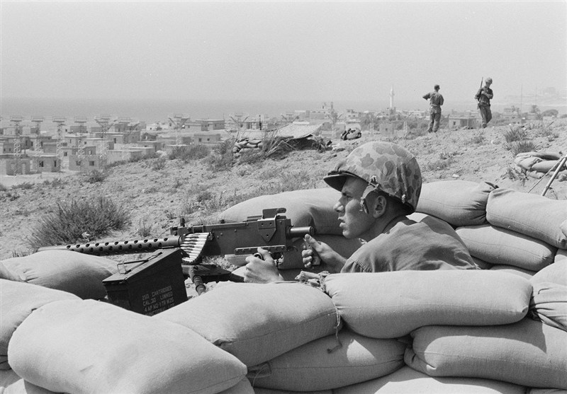 یک تفنگدار دریایی آمریکا در سنگر (فاکسهول) در حومه بیروت، در جریان بحران لبنان 1958