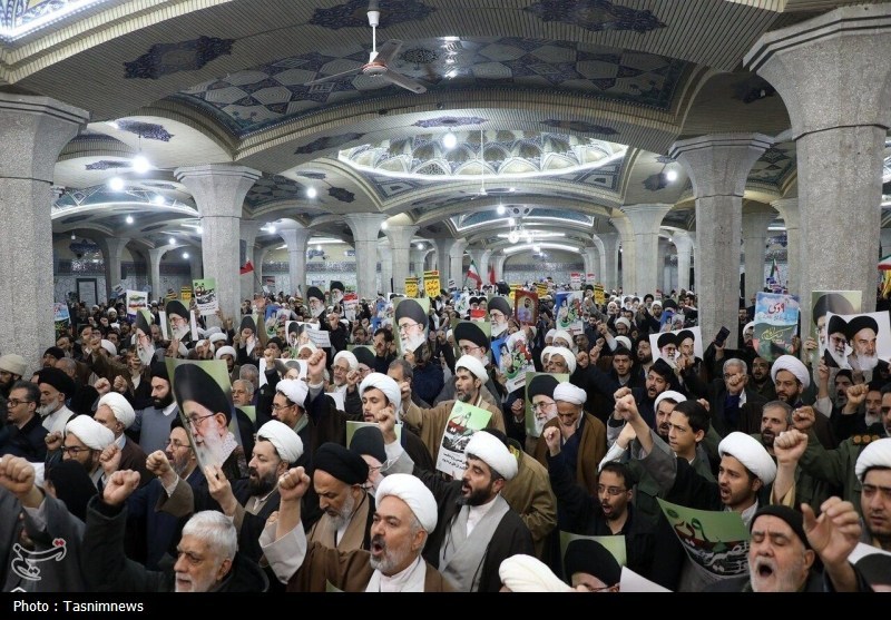 شعارهای «الله اکبر، الله اکبر / خامنهای رهبر»، «مرگ بر آمریکا»، «مرگ بر اسرائیل»، «مرگ بر فتنه گر»، «ای رهبر آزاده / آمادهایم آماده»، حسین حسین شعار ماست / شهادت افتخار ماست»، «ما همه سرباز توئیم / خامنهای گوش به فرمان توئیم خامنهای» و ... در فضای مدرسه علمیه فیضیه طنین انداز شد.