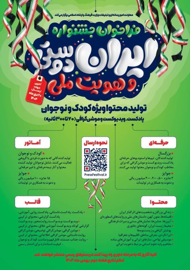 به گزارش گروه اجتماعی خبرگزاری تسنیم، معاونت امور رسانهای و تبلیغات وزارت فرهنگ و ارشاد اسلامی فراخوان تولید پادکست و ویدیوکست با محور «ایراندوستی و هویت ملی» را با تمرکز بر محتوای ویژه کودک و نوجوان منتشر کرد.