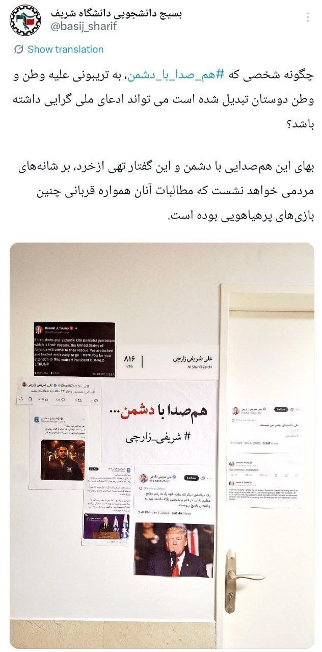 بسیج دانشجویی دانشگاه صنعتی شریف اظهارات اخیر شریفی زارچی را هم‌صدایی با دشمن خواند.