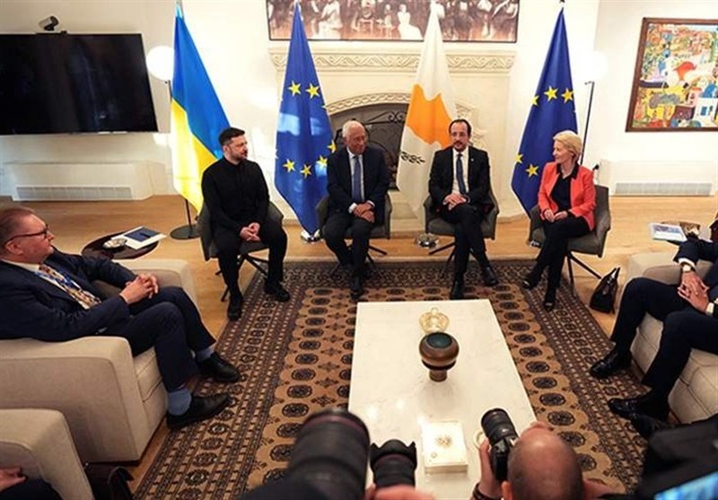 به گزارش گروه بین‌الملل خبرگزاری تسنیم، اورسولا فون در لاین، رئیس کمیسیون اروپا و آنتونیو کوشتا، رئیس شورای اروپا با ولودیمیر زلنسکی، رئیس‌جمهور اوکراین در نیکوزیا، پایتخت قبرس دیدار کردند و در این دیدار موضوع عضویت اوکراین در اتحادیه اروپا مورد بررسی قرار گرفت.