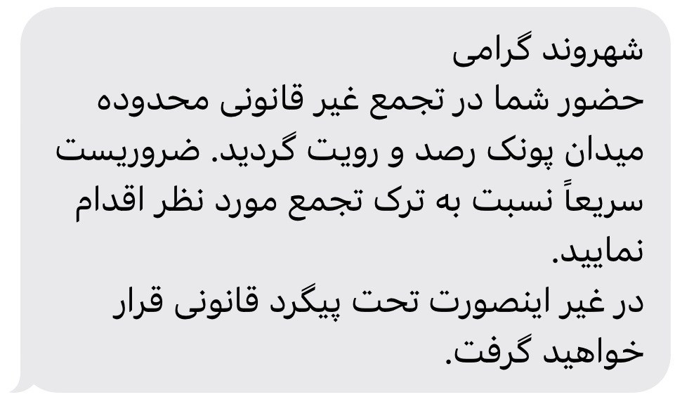 در این پیامک آمده است که در صورت ادامه حضور در تجمع، فرد مورد نظر تحت پیگرد قانونی قرار خواهد گرفت.