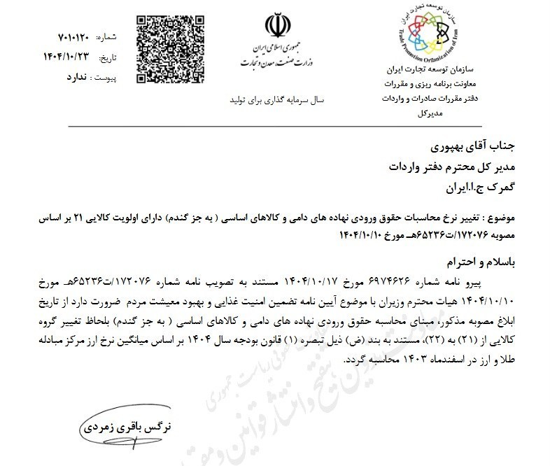 به گزارش خبرگزاری تسنیم، بخشنامه سازمان توسعه تجارت ایران با موضوع تغییر نرخ محاسبات حقوق ورودی نهاده های دامی و کالاهای اساسی (به جز گندم) دارای اولویت کالایی توسط مدیرکل دفتر مقررات صادرات و واردات معاونت برنامه ریزی و مقررات سازمان توسعه تجارت ایران ابلاغ شد.