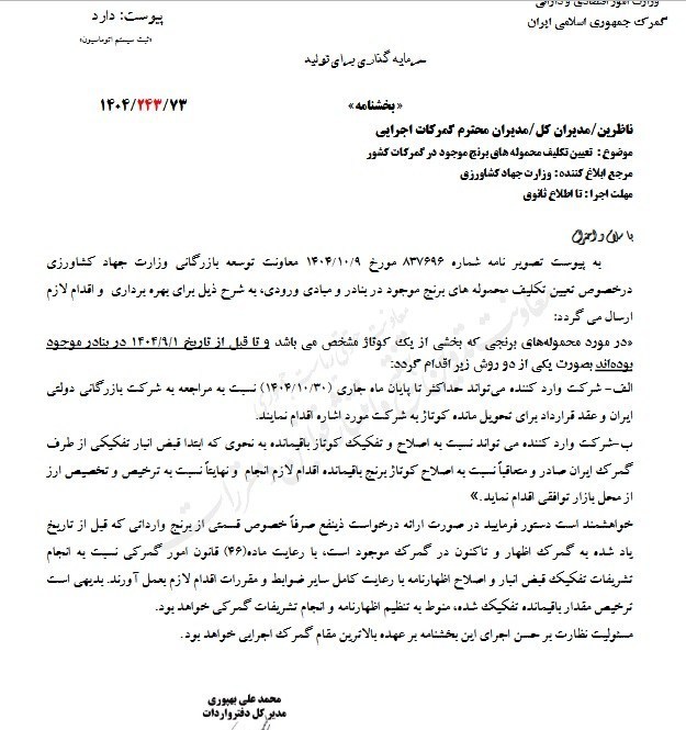 در مورد محموله های برنجی که بخشی از یک کوتاژ مشخص می باشد و تا قبل از تاریخ 1404.9.1 در بنادر موجود بوده اند بصورت یکی از دو روش زیر اقدام گردد:
