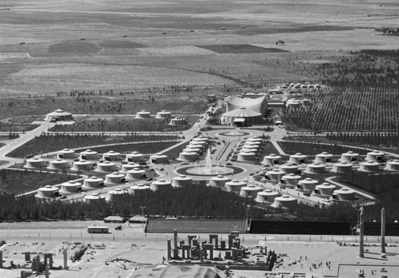 «بهدستور شاه در این جشنها 62 چادر در یک محوطه لمیزرع برافراشته شد و درون هر کدام را نیز با پردههای مخمل بنفش، چلچراغهای برنز مطلا، و میز سنگ مرمر صورتی، تزیین کردند تا مورد استفاده مدعوین قرار گیرد. برای تأسیسات مورد نظر جشنهای 2500 سال شاهنشاهی از یک سال قبل، کاروان کامیونها وسایل مورد نیاز را به محل برگزاری آن حمل کردند، و چون همه سران کشورها به جشن دعوت شده بودند، برای پذیرایی از آنها 165 سرآشپز و پیشخدمت و گارسن را مستقیماً از رستوران «ماکسیم» پاریس با هواپیما به ایران آوردند، و 2500 بطری شراب درجهیک نیز به فرانسه سفارش دادند که قیمت هر بطری آن سر به یکصد دلار میزد.» [مینو صمیمی، پشتپرده تختطاووس، ترجمه: دکتر حسین ابوترابیان]