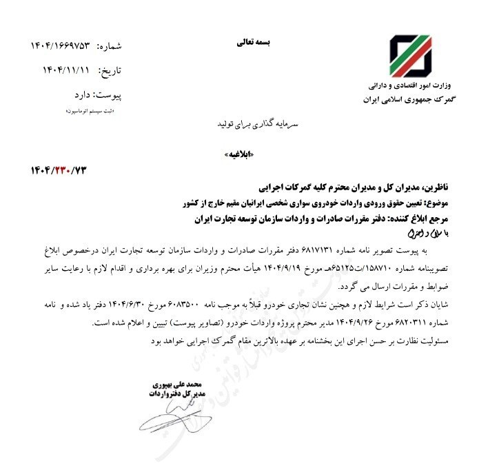به گزارش خبرگزاری تسنیم، ابلاغیه گمرک در رابطه با تعیین حقوق ورودی واردات خودروی سواری شخصی ایرانیان مقیم خارج از کشور توسط مدیرکل دفتر واردات گمرک جمهوری اسلامی ایران ابلاغ شد.