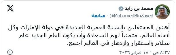 به گزارش گروه بین الملل خبرگزاری تسنیم، شیخ محمد بن زاید آل نهیان، رئیس امارات متحده عربی، امروز با انتشار پیامی در حساب رسمی خود در پلتفرم ایکس، فرا رسیدن ماه مبارک رمضان را به مردم این کشور و کشورهای اسلامی تبریک گفت تا به شایعات و گزارش ها درباره بیماری خود پایان دهد.