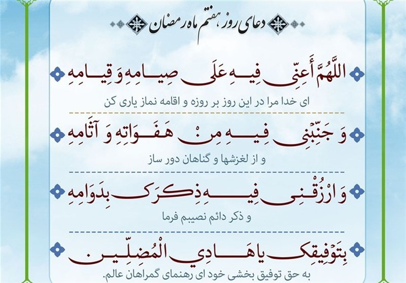 به گزارش خبرنگار فرهنگی خبرگزاری تسنیم، پیامبر (ص) برای هر روز از ماه رمضان دعایی ذکر فرموده‌اند و دعای روز هفتم این ماه مبارک به شرح زیر است: