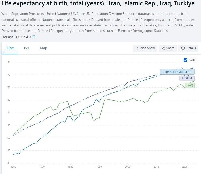 نمودار زیر روند امید به زندگی در کشورهای ایران، عراق و ترکیه را از سال 1960 تا 2020 نشان می هد.