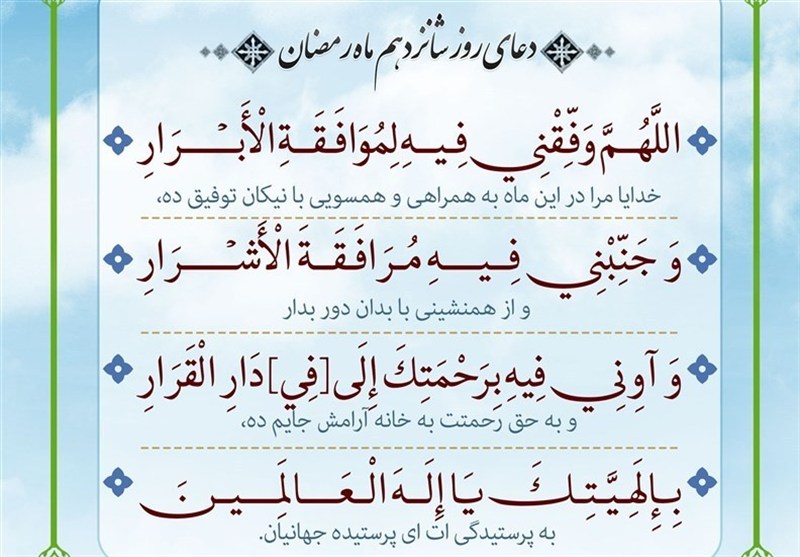 اللهمّ وَفّقْنی فیهِ لِموافَقَةِ الأبْرارِ وجَنّبْنی فیهِ مُرافَقَةِ الأشْرارِ وأوِنی فیهِ بِرَحْمَتِکَ الى دارِ القَرارِ بالهِیّتَکِ یا إلَهَ العالَمین.