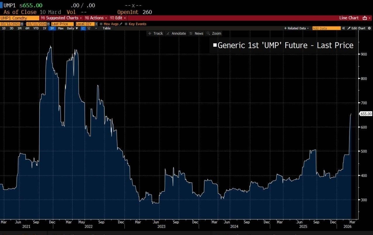 به گزارش خبرگزاری تسنیم، درپی جنگ افروزی آمریکا و اسرائیل علیه ایران، قیمت کودهای شیمیایی در آمریکا 77 درصد افزایش یافته است، زیرا یک سوم کل کودها از طریق تنگه هرمز حمل و نقل میشوند.
