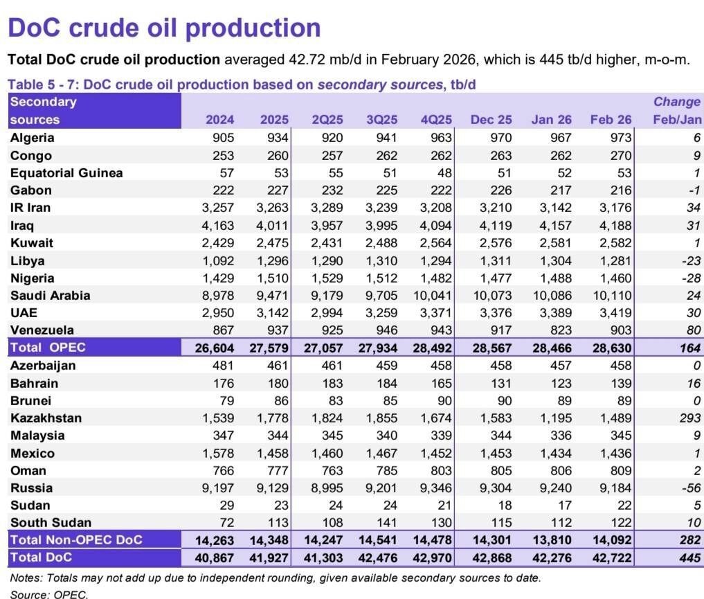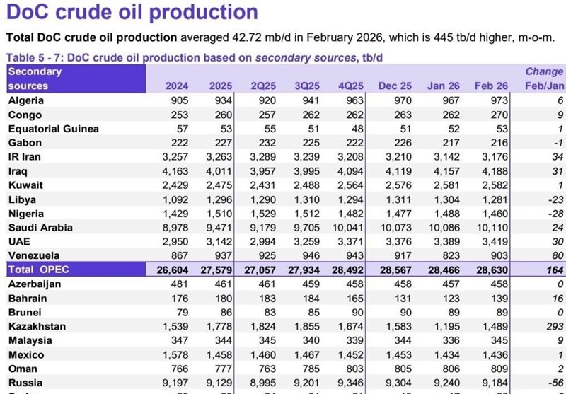 تولید نفت 12 کشور عضو این سازمان بر اساس تازه‌ترین گزارش (ماه مارس 2026)، در ماه فوریه 2026 (بهمن - اسفند)، درمجموع 28 میلیون و 630 هزار بشکه در روز بوده که نسبت به ماه ژانویه (دی - بهمن)، 164 هزار بشکه در روز افزایش داشته است.
