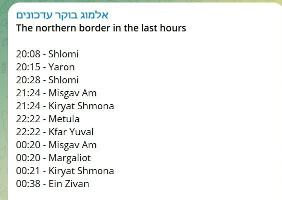 به این ساعتهایی که در تصویر آمده توجه کنید! این فقط آژیرهای هشدار و شلیک از ناحیه ایران یا حزبالله به شمال سرزمینهای اشغالی طی 3-4 ساعت است! هر بار که موشک یا پهپادی از ایران یا حزبالله به سمت سرزمینهای اشغالی میآید، صدای آژیرها بلند میشود و صهیونیستها باید به پناهگاه بروند و سپس اعلام میشود که میتوانند از پناهگاه خارج شوند.