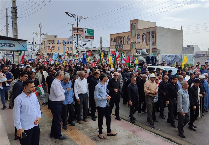 به گزارش خبرگزاری تسنیم از بندر دیر، همزمان با آخرین جمعه ماه مبارک رمضان، صبح امروز مردم روزهدار شهرستان دیر در جنوب استان بوشهر با حضور گسترده در راهپیمایی روز جهانی قدس، حمایت خود از مردم فلسطین را اعلام کردند.