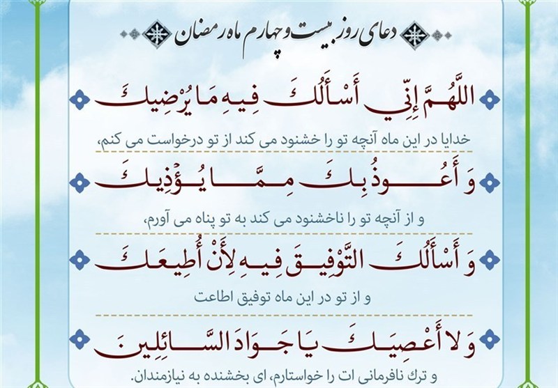 به گزارش خبرنگار فرهنگی خبرگزاری تسنیم، پیامبر(ص) برای هر روز از ماه رمضان دعایی ذکر فرموده‌اند و دعای روز بیست و چهارم این ماه مبارک به شرح زیر است: