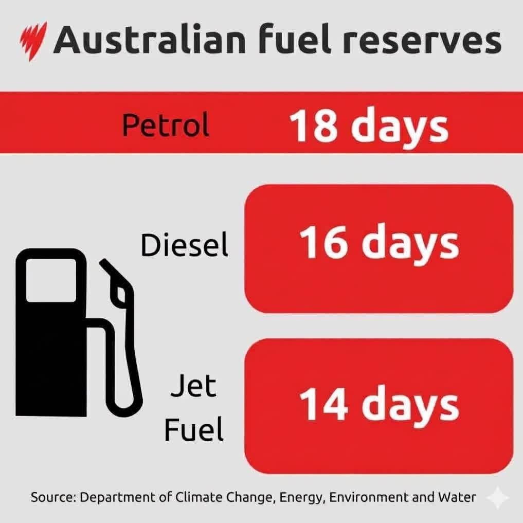 به گزارش خبرگزاری تسنیم، کریس بوون وزیر انرژی استرالیا اعلام کرد: فقط 18 روز بنزین؛ 16 روز گازوئیل و 14 روز سوخت هواپیما داریم.