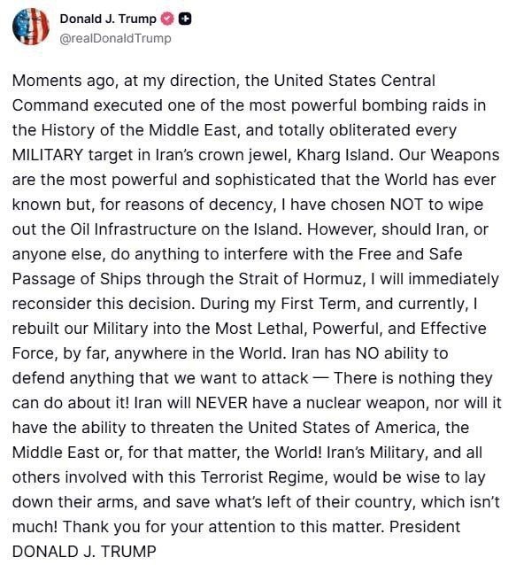 پس از حمله مستقیم آمریکا به جزیره خارک، دونالد ترامپ برای قدرتنمایی توییتی منتشر کرد که واکاوی دقیق آن نشان میدهد این پیام، بیشتر از آنکه بیانگر واقعیتهای میدانی و نظامی باشد، شبیه به بیانیههای سیاسی است. هدف اصلی و پنهان این اعلامیه، طراحی یک «عملیات روانی» گسترده برای ایجاد ثبات مالی در اقتصاد بههمریخته جهانی و کنترل وحشت در بازارهای سرمایه بود.
