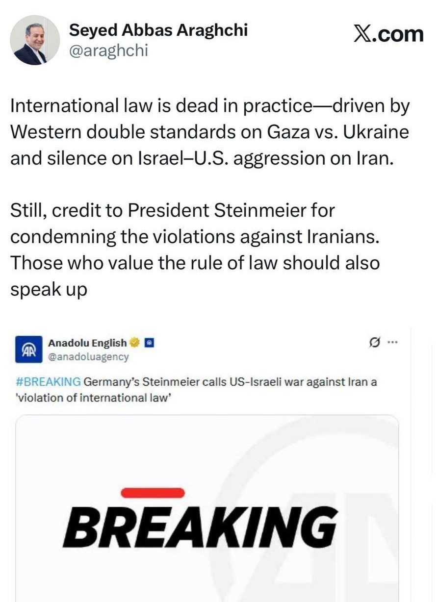 عباس عراقچی، وزیر امورخارجه جمهوری اسلامی با بازنشر سخنان رئیسجمهور آلمان،در صفحه خود در ایکس(توییتر) نوشت: حقوق بینالملل در عمل رو به زوال است؛ این واقعیتی که از استانداردهای دوگانه غرب در قبال غزه، نسبت به اوکراین و نیز سکوت در برابر تجاوز آمریکا و رژیم صهیونیستی علیه ایران ناشی میشود.