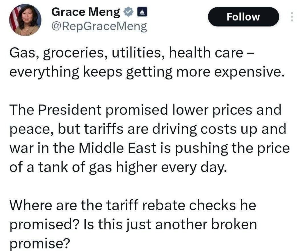 رئیس‌جمهور وعده داده بود قیمت‌ها را پایین بیاورد و صلح برقرار کند، اما تعرفه‌ها در حال بالا بردن هزینه‌ها هستند و جنگ در خاورمیانه هر روز قیمت یک باک بنزین را بیشتر می‌کند.