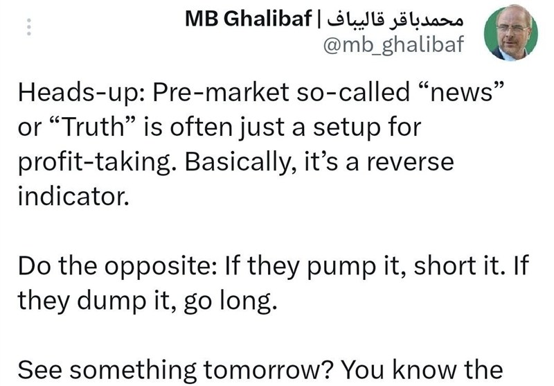 به گزارش خبرگزاری تسنیم، ساعتی قبل از بازشدن بازارهای جهانی و اعلام قیمتها، محمدباقر قالیباف در توئیتی به زبان انگلیسی و البته تخصصی خطاب به فعالان اقتصادی متنی نوشت که به زبان ساده و قابل فهم چنین بود: