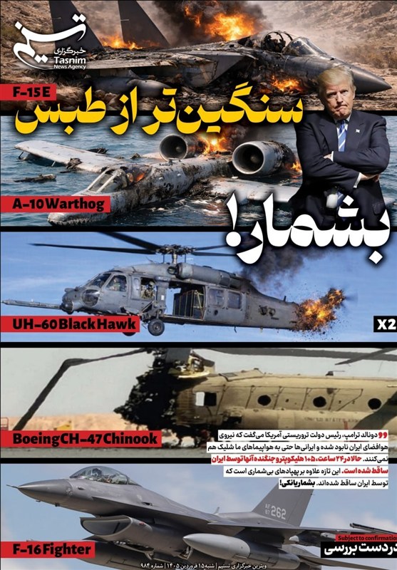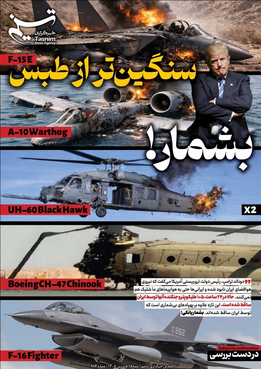 به گزارش خبرگزاری تسنیم، دونالد ترامپ، رئیس دولت تروریستی آمریکا می‌گفت که نیروی هوافضای ایران نابود شده و ایرانی‌‌ها حتی به هواپیماهای ما شلیک هم نمی‌کنند. حالا در 24 ساعت، 5+1 هلیکوپتر و جنگنده آنها توسط ایران ساقط شده است. این تازه علاوه بر پهپادهای بی‌شماری است که توسط ایران ساقط شده‌اند. این بار آمریکا شکستی بسیار بدتر از شکست طبس را تجربه کرده است. بشمار یانکی!