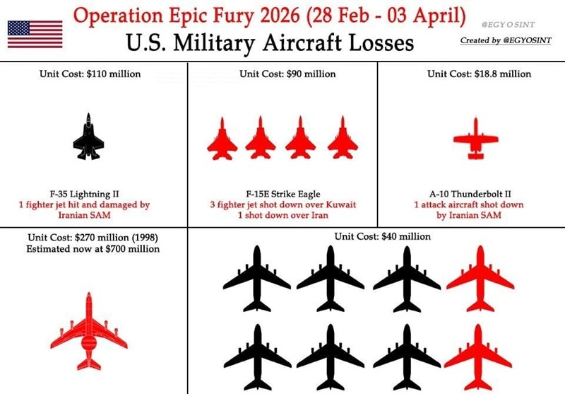 به گزارش خبرگزاری تسنیم، برخی از تسلیحات هوایی آمریکا که از ابتدای جنگ با ایران تا کنون آسیب دیده یا نابود شده است: