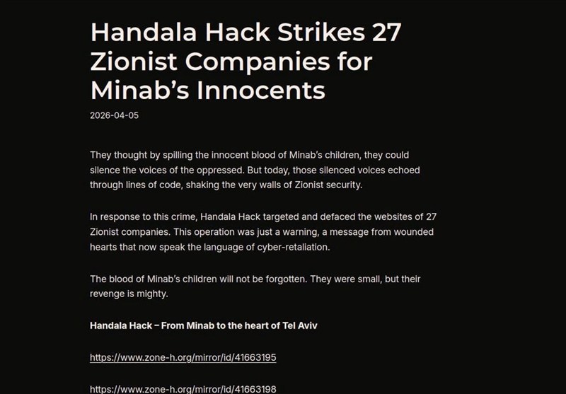 به گزارش گروه بینالملل خبرگزاری تسنیم، گروه سایبری حنظله اعلام کرد در واکنش به جنایت فراموش نشدنی میناب، وبسایت شماری از شرکتهای اسرائیلی را هدف حمله قرار داده است.