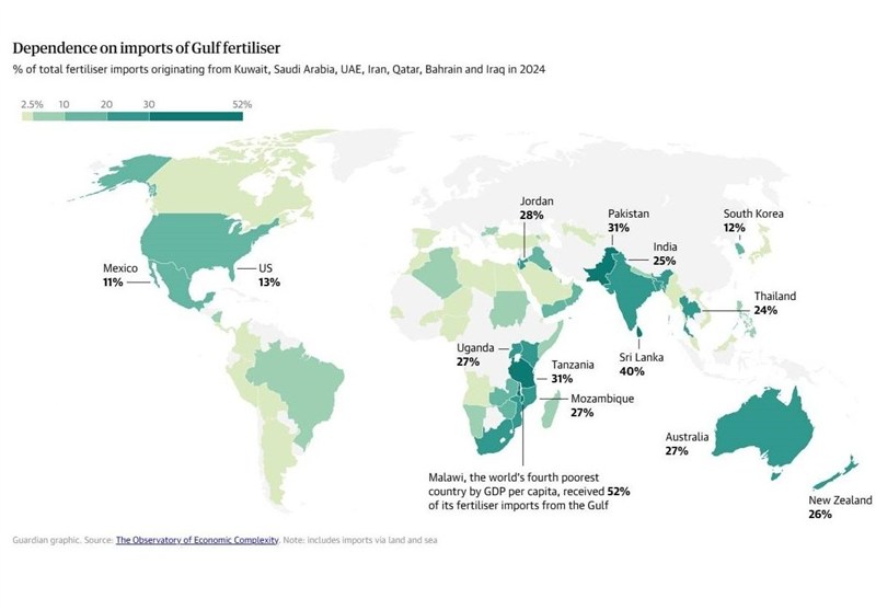 به گزارش خبرنگار اقتصادی خبرگزاری تسنیم، بر اساس گزارشی که از سوی گاردین منتشر شده است، اختلال در صادرات کود از خلیج فارس، دامنهای فراتر از منطقه دارد و از جنوب آسیا تا آفریقا و اقیانوسیه و حتی آمریکا و مکزیک را نیز درگیر کرده است.