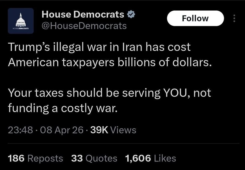به گزارش خبرگزاری تسنیم، اکانت متعلق به دموکراتهای کنگره امریکا نوشت: « جنگ غیرقانونی ترامپ علیه ایران میلیاردها دلار برای مالیاتدهندگان آمریکایی هزینه داشته است.