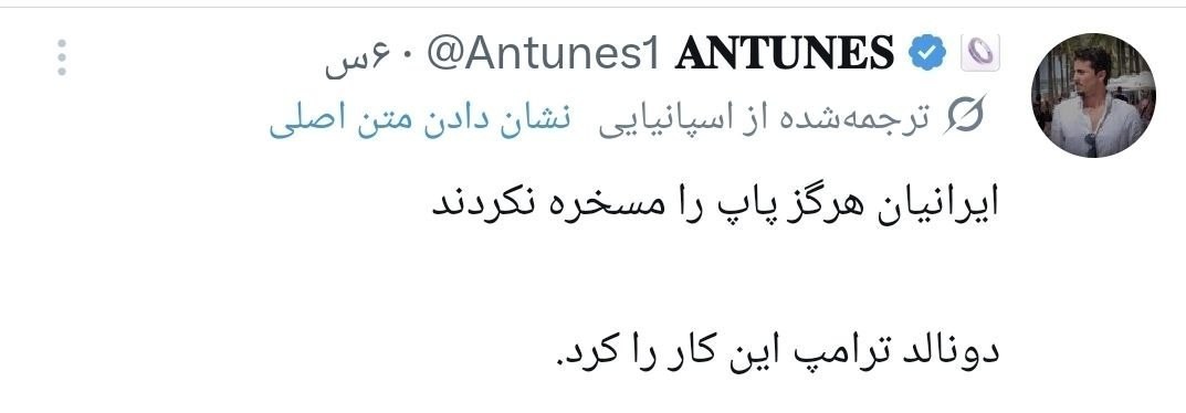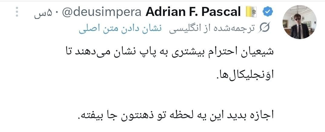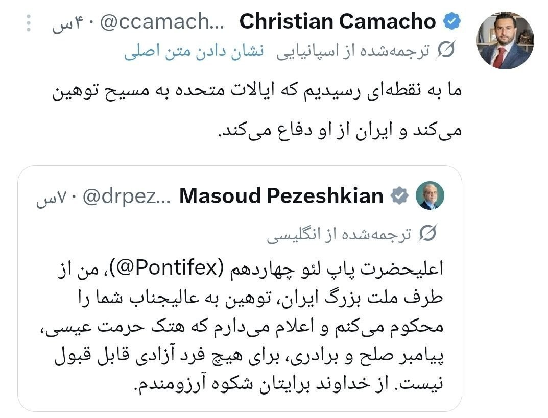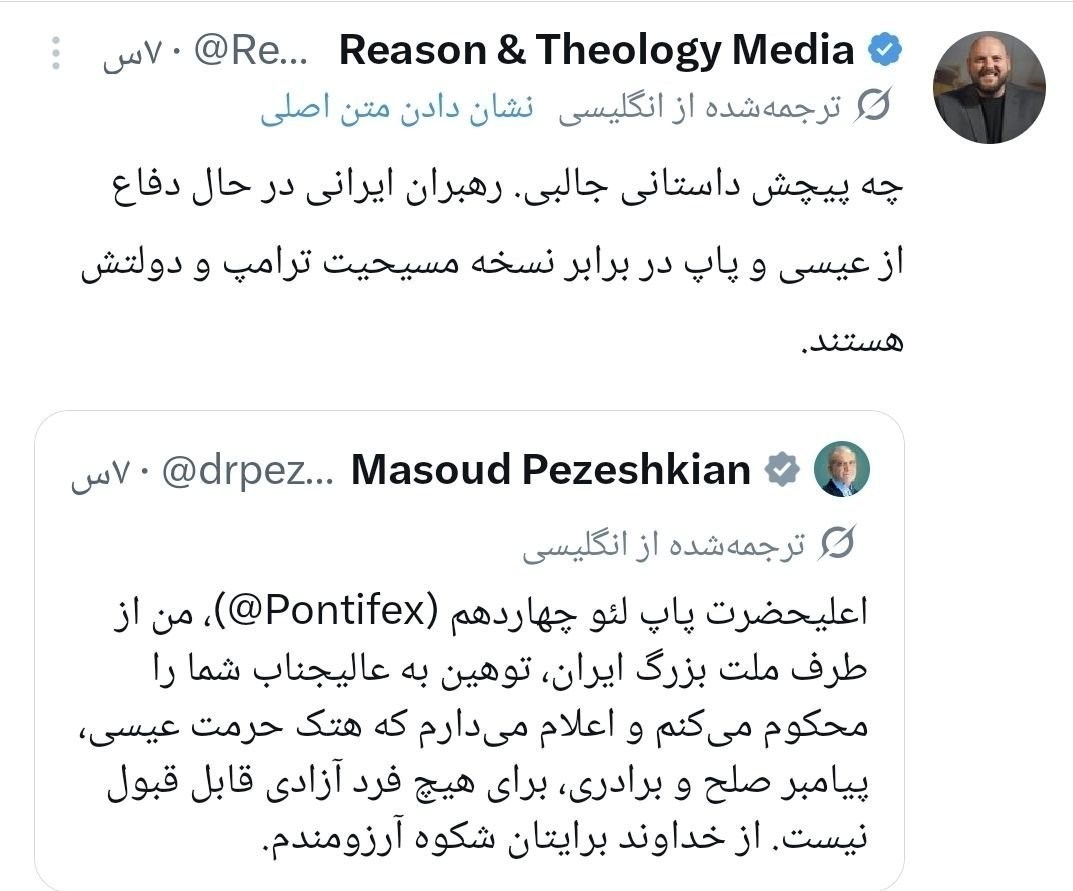 آقای «پزشکیان» رئیسجمهور ایران بعد از این اهانت ترامپ، در پستی به زبان انگلیسی نوشت: اعلیحضرت پاپ لویی چهاردهم، من بهنمایندگی از ملت بزرگ ایران توهین به جنابعالی را محکوم میکنم و اعلام میکنم که هتک حرمت حضرت عیسی، پیامبر صلح و برادری، از هیچ انسان آزادهای پذیرفته نیست. از خداوند متعال برای شما آرزوی سربلندی دارم.