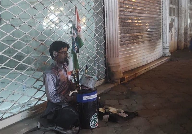 تصویری از جایی که سنگفرشهای سرد خیابان، میزبان گرمای وجود مردی شدهاند که گویی پاسبان بیدار ارزشهای یک ملت است، او در کنار کرکرههای بسته مغازهای نشسته است و با سازش، آهنگی غمگین را نت به نت مینوازد در حالی که پرچم ایران را روی بساط کوچکش آویخته، گویی میخواهد بگوید، هر شهروند، خود یک سرباز خط مقدم است.