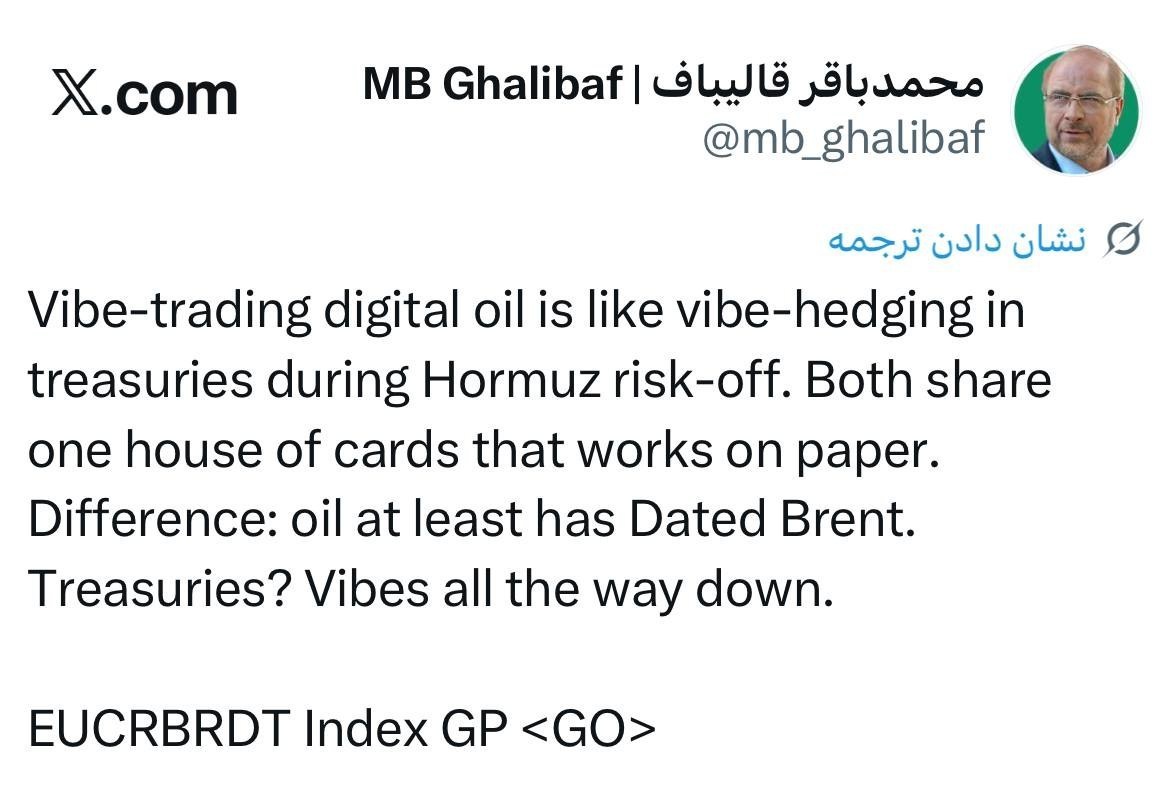 به گزارش خبرگزاری تسنیم، رئیس مجلس در ادامهٔ توییت‌های خود که با هدف هشدار به فعالان بازارهای مالی برای پرهیز از تحت تاثیر قرار گرفتن توسط کاغذبازی‌های دولتمردان آمریکا نوشته شده‌اند در شبکهٔ ایکس نوشت: هم قیمت نفت دیجیتال(کاغذی)  بر اساس جو بازار تعیین می‌شود و هم اوراق قرضه، و هر دوی آنها خانه‌های پوشالی هستند که نمی‌توان به آنها اعتماد کرد؛ معیار اصلی، قیمت نفت فیزیکی یعنی همان قیمتی است که نفت واقعا خرید و فروش می‌شود و بر اساس معاملات واقعی بازار تعیین می‌شود. با این تفاوت که در مورد نفت حداقل شاخصی با عنوان قیمت نفت فیزیکی وجود دارد که میزان دستکاری‌شدن قیمت نفت دیجیتال را مشخص کند اما در مورد اوراق قرضه چنین نیست و همه چیز فقط بر خانه‌ای پوشالی بنا شده است.