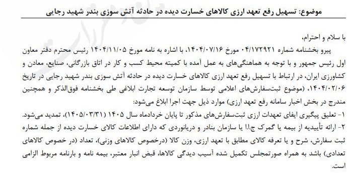 به گزارش خبرنگار اقتصادی خبرگزاری تسنیم، بانک مرکزی با صدور بخشنامه شماره 04/317637 مورخ 19 اسفند 1404، جزئیات دقیق نحوه رسیدگی به تعهدات ارزی کالاهای خسارت‌دیده در حادثه آتش‌سوزی بندر شهید رجایی را اعلام کرد؛ بخشنامه‌ای که علاوه بر تعیین سازوکارهای اجرایی، چند بند کلیدی و الزام‌آور را خطاب به شبکه بانکی و دستگاه‌های مرتبط گوشزد می‌کند.