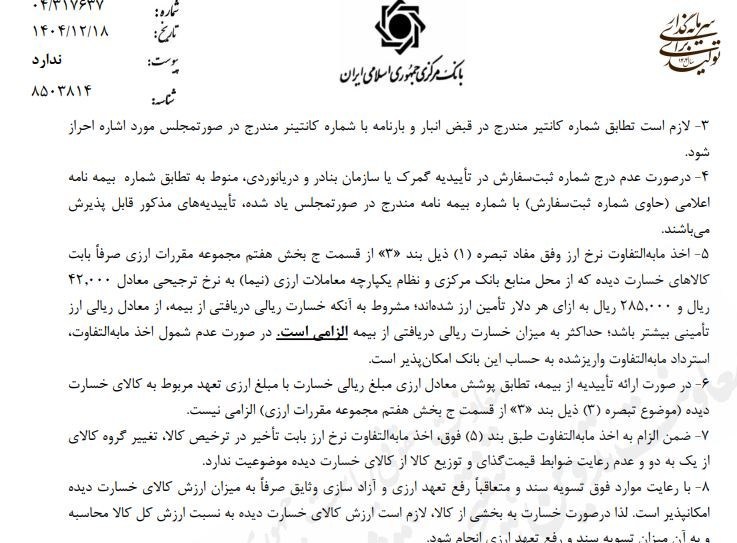 بر اساس این نامه، بانک مرکزی با اشاره به مکاتبه معاون اول رئیس‌جمهور و گزارش‌های ارائه‌شده از سوی کمیته محیط کسب‌وکار، تأکید کرده که رفع تعهد ارزی کالاهای سوخته، مشروط به ارائه مستندات بیمه، گزارش گمرک و مدارک میزان خسارت است. در متن آمده که شماره قبض انبار، شماره بارنامه و اطلاعات دقیق کانتینر باید «کاملاً تطبیق داده شود» و در صورت عدم تطابق، گواهی سازمان بنادر و دریانوردی و همچنین بیمه‌نامه مربوط باید مجدداً تأیید شود.
