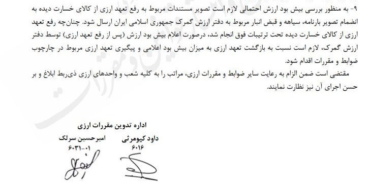 در بخش پایانی نیز اداره تدوین مقررات ارزی تأکید کرده که پیگیری و نظارت بر اجرای این دستورالعمل برعهده تمام واحدهای ارزی بانک‌هاست و هرگونه قصور در بررسی یا تطبیق مدارک می‌تواند موجب تضییع حقوق صاحبان کالا شود. نامه با امضای داود کیومرسی و امیرحسین سرلک ابلاغ شده است.