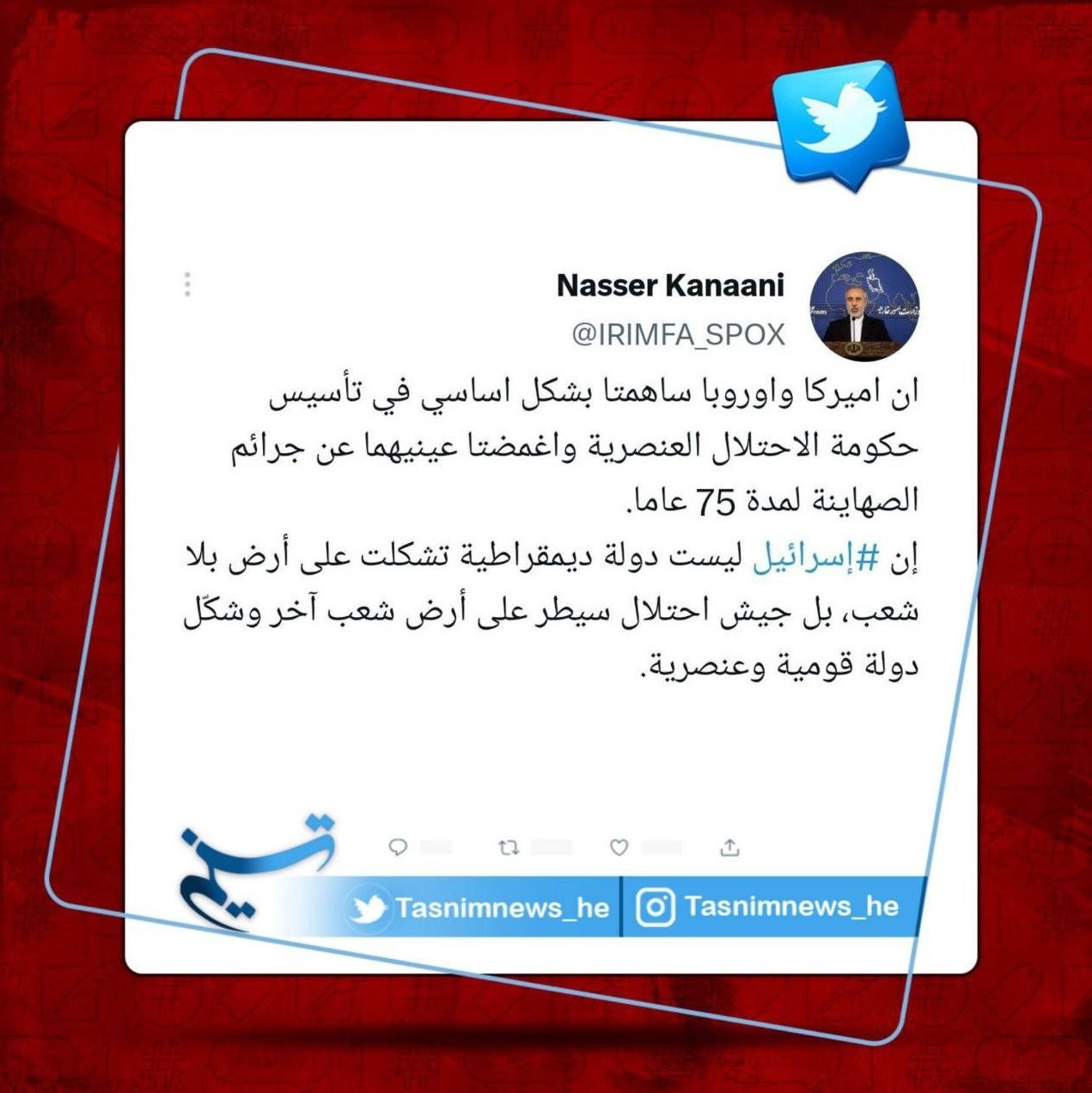 בחלק אחר של הודעת הטוויטר שלו הוסיף דובר משרד החוץ של איראן: "בניגוד למה שאומרים הציונים ותומכיהם המערביים, ישראל היא לא מדינה דמוקרטית שנוצרה בארץ ללא אומה אבל זה צבא כובש ששולט בארצו של אומה אחרת והקים מדינה אתנית וגזעית.