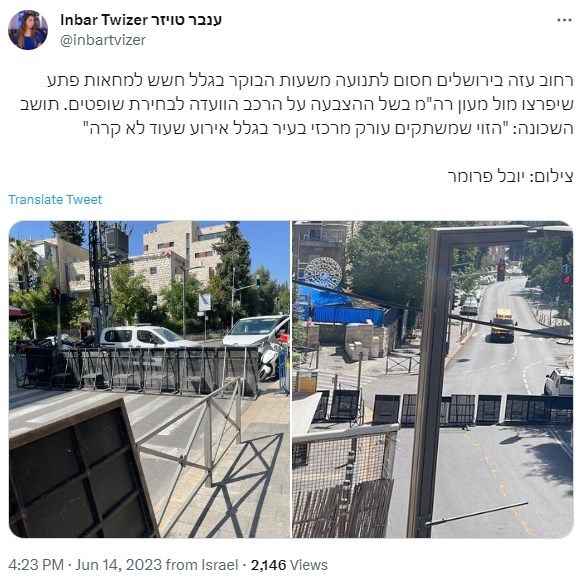 המשטרה הציבה מחסומים ברחוב עזה בירושלים, שבו יש דירה של ראש הממשלה בנימין נתניהו, בציפייה לכאורה למחאה אפשרית של מתנגדי הטלטלה השיפוטית.