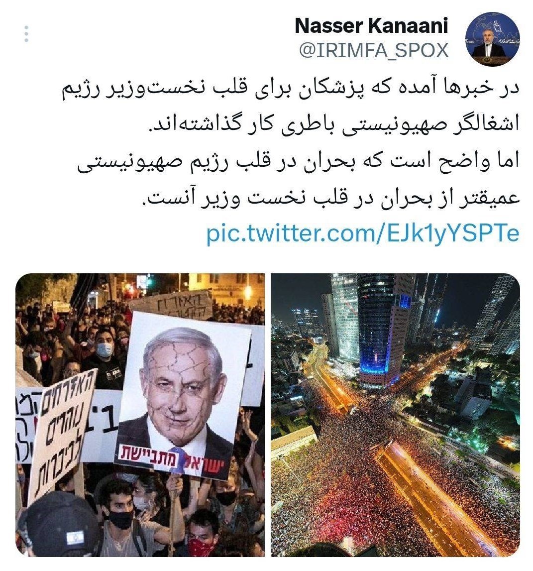 ברור שהמשבר בלב הישות הציוני בישראל חמור יותר מהמשבר בלב ראש ממשלתו, בנימין נתניהו, כך הודיע דובר משרד החוץ האיראני