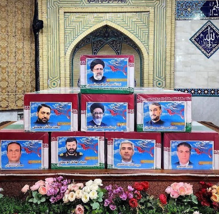 מאז 7:30 בבוקר החלו טקסי ההלוויה של חללי השירות באוניברסיטת טהראן: נשיא הרפובליקה, האייתוללה אברהים ראיסי, שר החוץ, חוסיין אמיר עבדאללהיאן, האייתוללה מוחמד עלי אל האשם, מושל מזרח אזרבייג'ן, מאלק רחמתי, ראש צוות ההגנה של הנשיא, מהדי מוסאווי, והטייס טאהר מוסטפאווי, טייס המשנה מוחסן דריאנוש, וטייס המשנה הטכני בהרוז קאדימי.