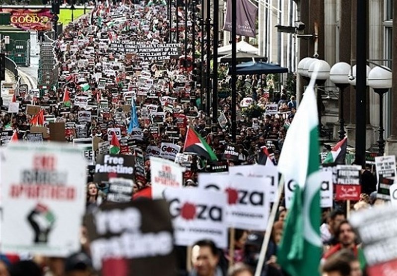 מפגינים, אוחזים בדגלי פלסטין וכרזות עם סיסמאות כמו "שחררו את פלסטין" ו"תפסיקו לתמוך בישראל", דרשו להפסיק את הנשק והתמיכה הדיפלומטית של לונדון בתל אביב.